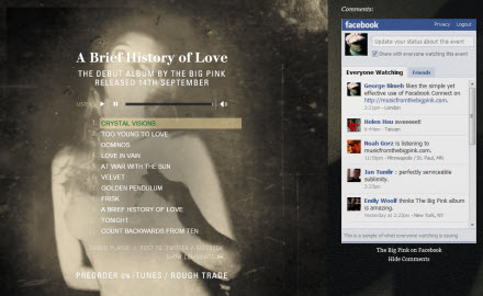 The Big Pink's debut album, A Brief History of Love, and it demonstrates how well Facebook is adapting given the expectations that come with real-time digital communications. It is a simple site with a straight-forward implementation of Facebook Connect allowing people to post comments from the band's album preview page. Nothing too fancy, but it works really well.